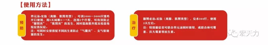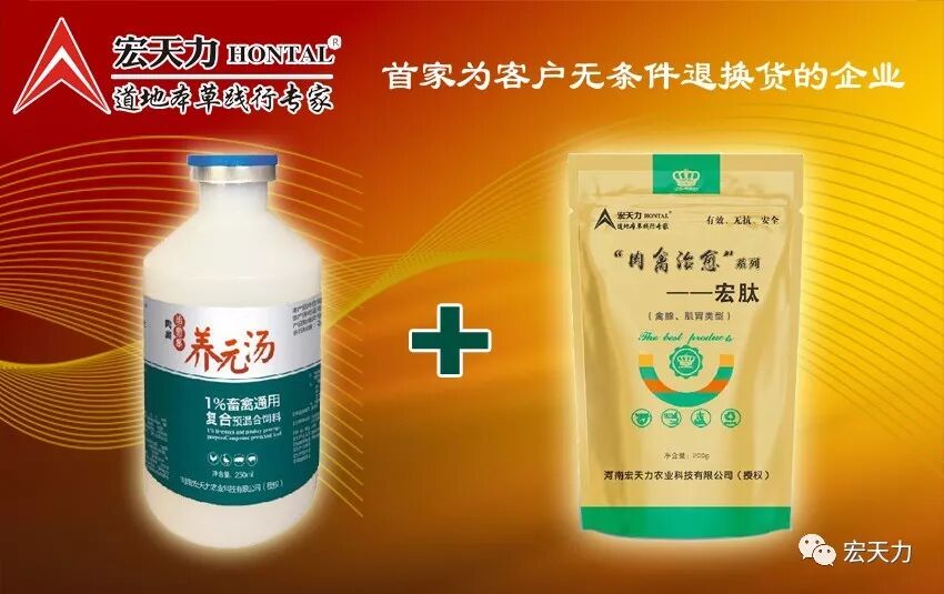 “养元汤”(300—400斤水)或“腺胃必治”(250斤水左右)+宏肽(腺肌胃炎型)(300—400斤水),连用4—5天;之后,“优重135系列”(宏肽-肉禽专用+宏天力增肥王)前5—7天2000—2500斤水/组,后期3000—3500斤水/组添加。使用7天左右采食量恢复至90%以上,肠道、粪便基本正常;添加15天以上,采食量正常,出栏日龄正常。换料、生长后期不再用任何肠道类抗生素。