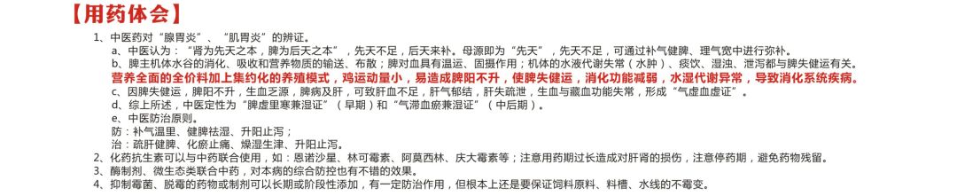 进入夏季,高温高湿,禽类无汗腺,若舍温过高会采食量不足;高温高湿中医认为易“湿困脾土”,出现脾虚、脾湿、脾热证,临床即表现为:食欲差、泄泻、粪腥臭(兼有热时)、呕吐等,同时本系列表现与不同程度的免疫抑制病也有一定关系,刚好与“养元汤”或“腺胃必治”临床指证相吻合。